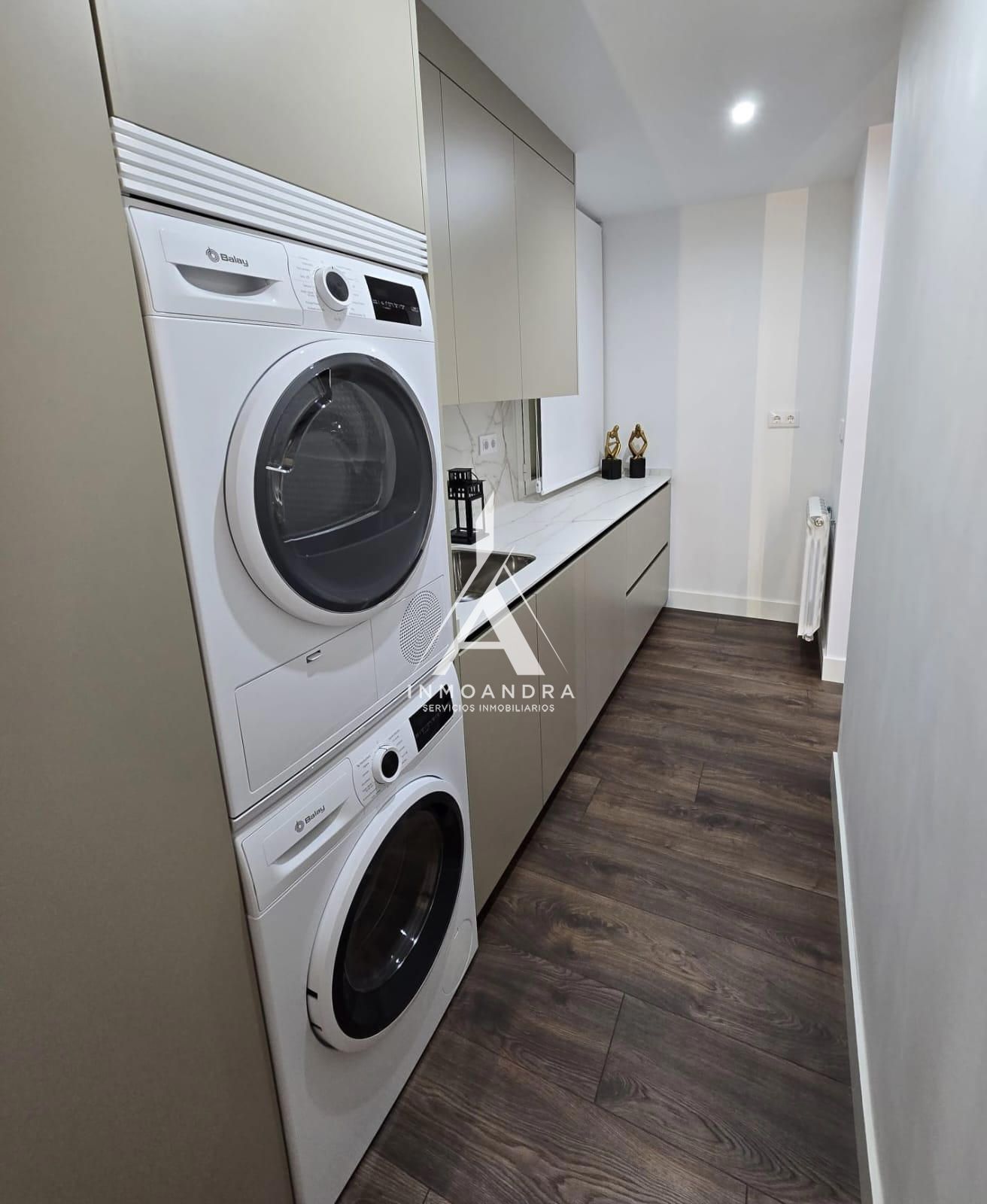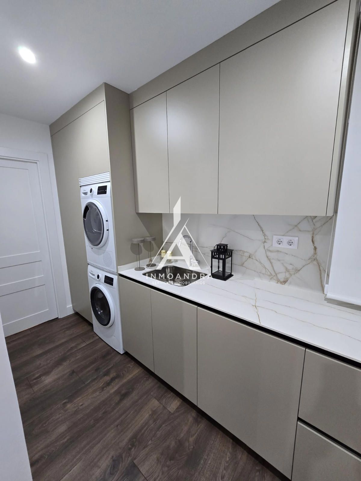 Cocina americana de Porcelanosa, en forma de isla, completamente amueblada y equipada con electrodomésticos de última generación y un lavadero independiente con todos los servicios, secadora, lavadora, fregadero.